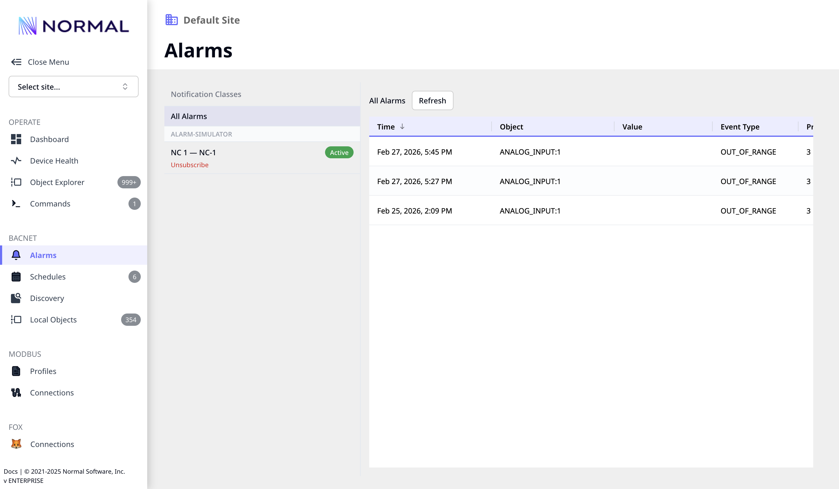 NF can receive and store BACnet event notifications from devices on the network. The Alarms page provides a central view for monitoring, filtering, and acknowledging alarms.