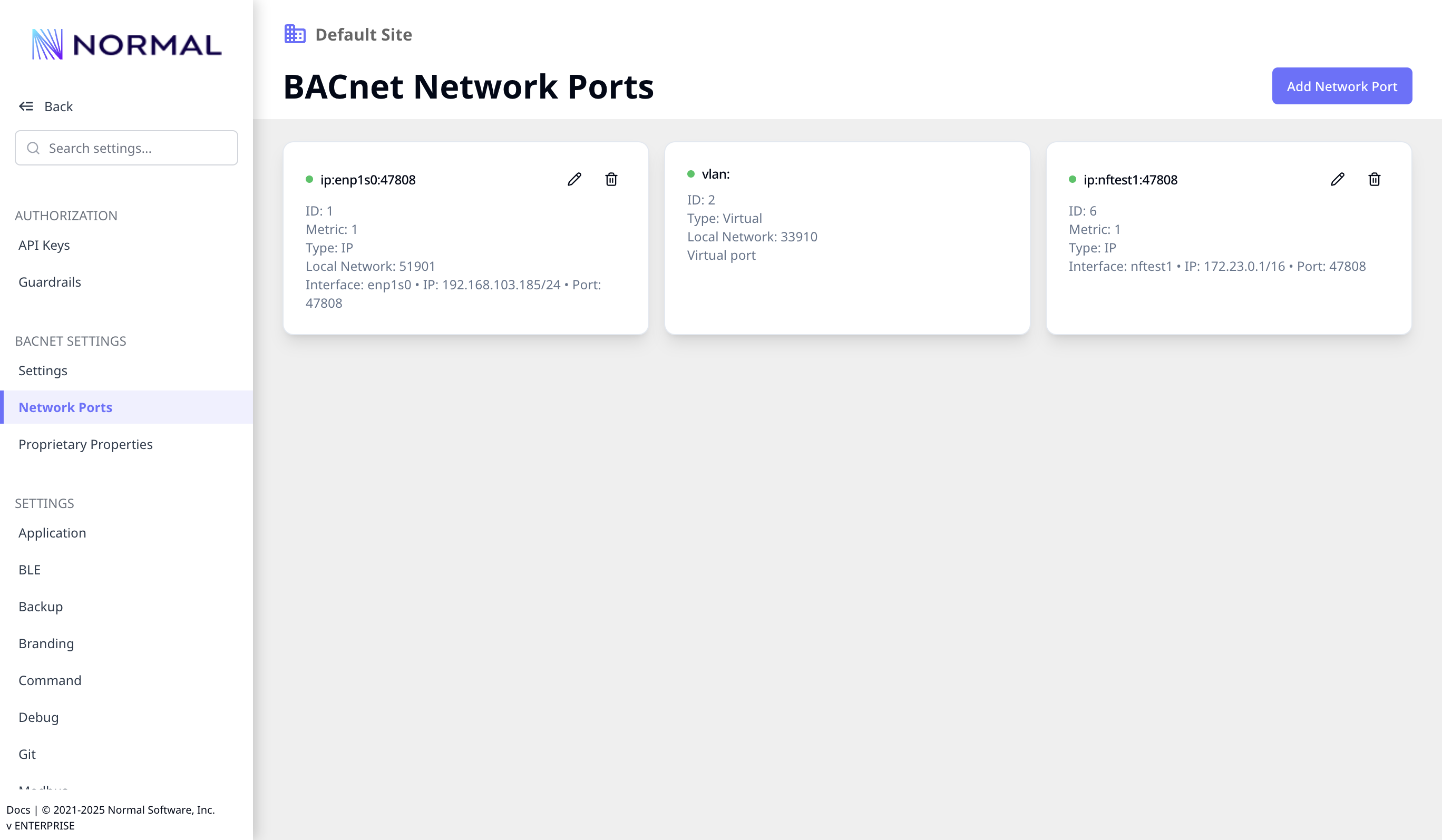 In BACnet's networking model, each link to a different BACnet network is encapsulated in a Network Port. As of version 3.9, Normal supports multiple network ports simultaneously; this allows for stable connections on multiple UDP ports, BBMDs, or BACnet/SC hubs. By default, Normal will configure a BACnet port on the first network interface.