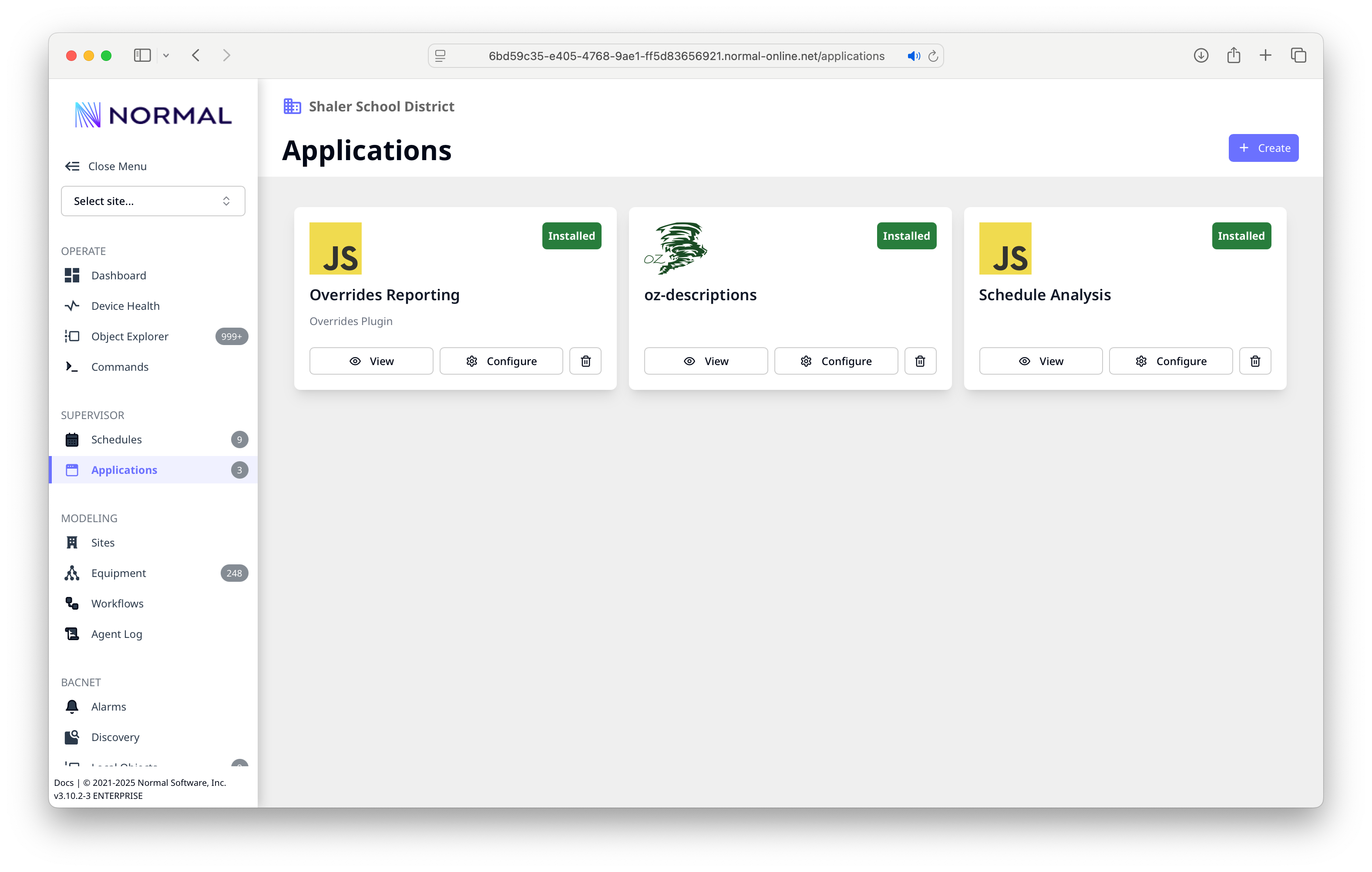 - Left nav sections -- organized by function: Operate (day-to-day), Supervisor (schedules and apps), Modeling (data normalization), and BACnet (protocol-level tools)