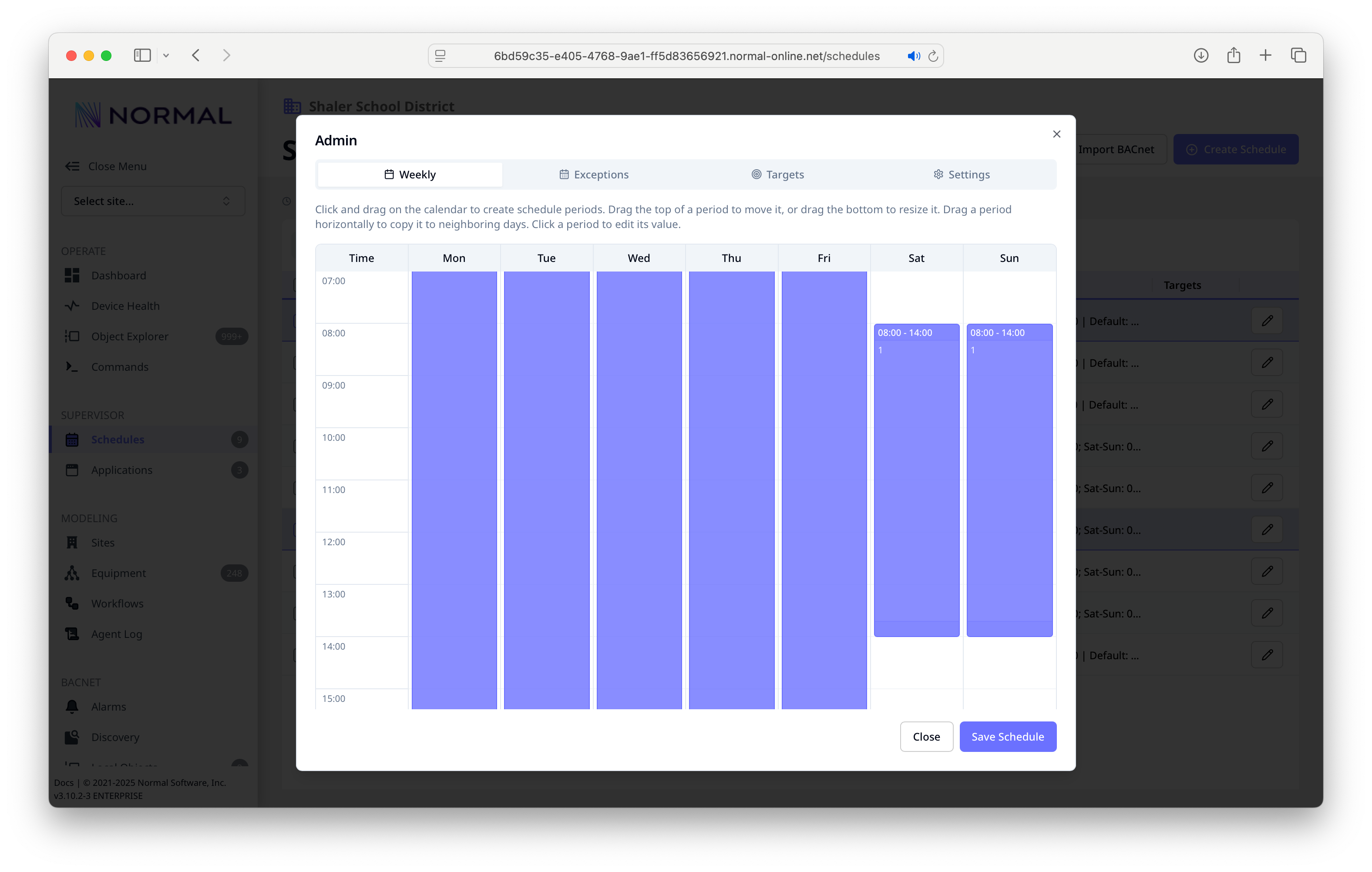 The Schedule editor provides a visual weekly timetable:
