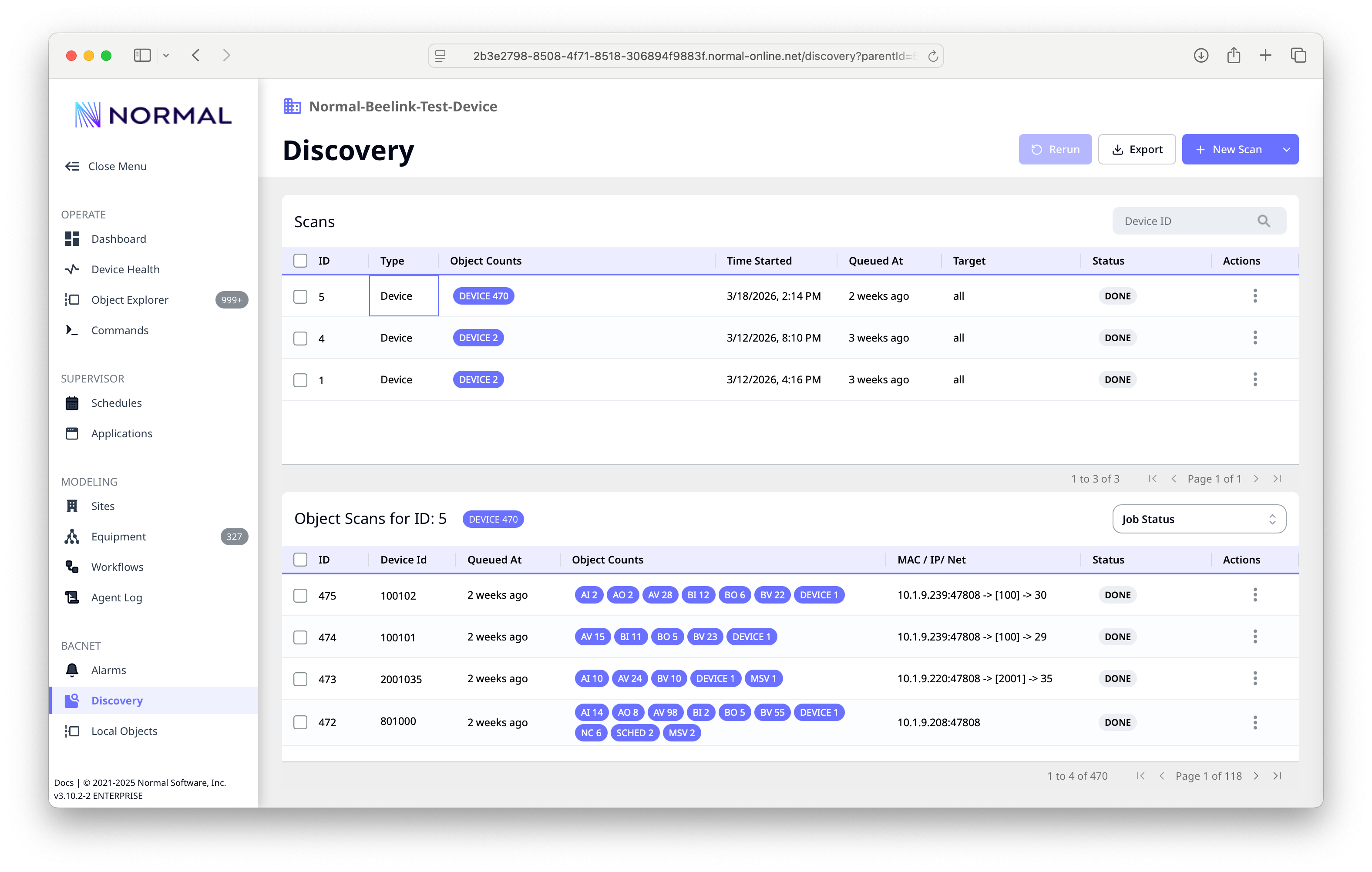 - Click New Scan and run a device discovery. NF sends a BACnet Who-Is broadcast and populates the device list.
