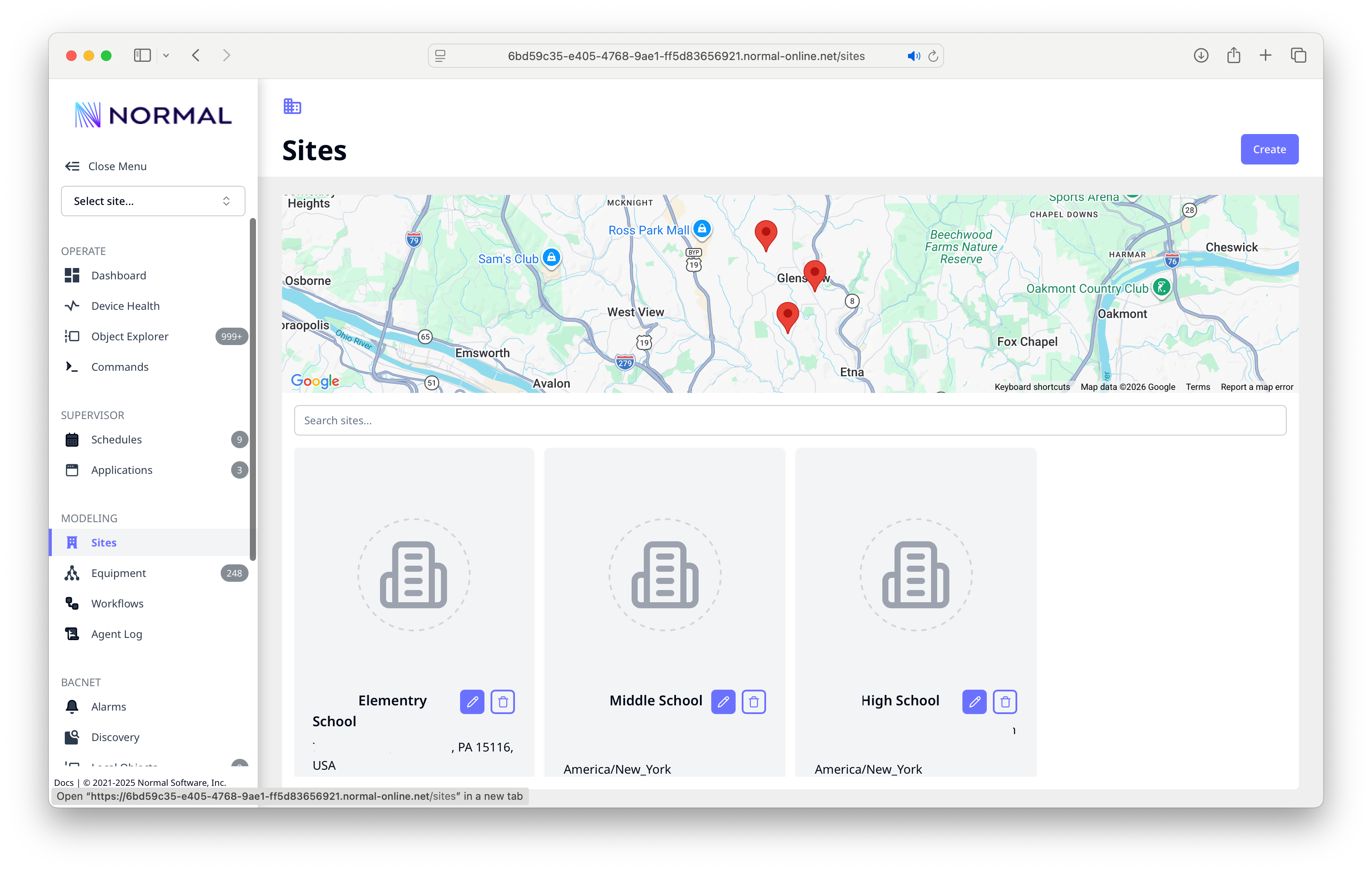 Sites represent buildings or physical locations. Creating a site helps organize your points and provides context like timezone and location.